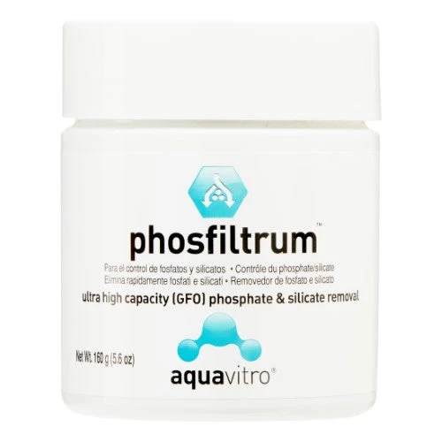 Aquavitro phosfiltrum is an ultra high capacity (GFO) phosphate and silicate remover. It is harder and less fragile than other GFOs, and offers the highest binding capacity of any phosphate remover per gram! Phosfiltrum has a distinctive dark brown color.
