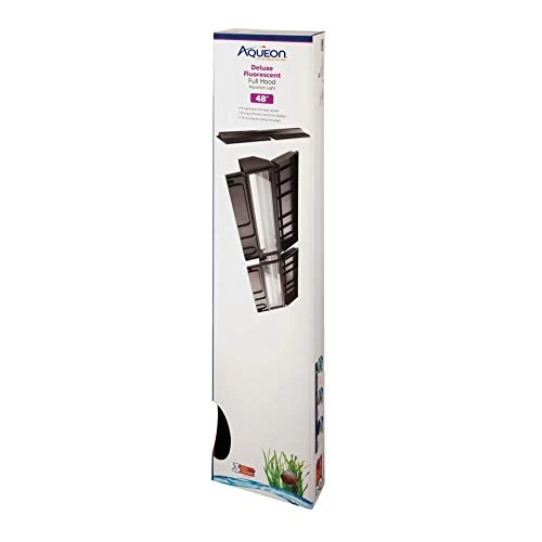 The 48″ Aqueon Deluxe Full Fluorescent Hood is an exceptionally versatile unit, designed to fit almost every major brand of aquarium on the market for unmatched user freedom. The hood itself is custom fit to sit on the inside lip of the aquarium frame, which greatly reduces water loss caused by constant evaporation as well as giving fishkeepers a peace of mind knowing that even the most athletic of fish won’t be able to jump out of the aquarium. The Aqueon Deluxe Full Fluorescent Hood features two full-length front facing doors that provide roomy access to the interior of the tank and cut-out section in the rear allows for the hassle free installation of various equipment such as heaters, power filters and other popular accessories. A powerful T8 Lamp and splash guard is included. The unit comes in a sleek black color and is suitable for aquarium sizes 33 gallon long, 40 gallon high and 55 gallon standard. 48.9″ x 9.6″ x 3.3″