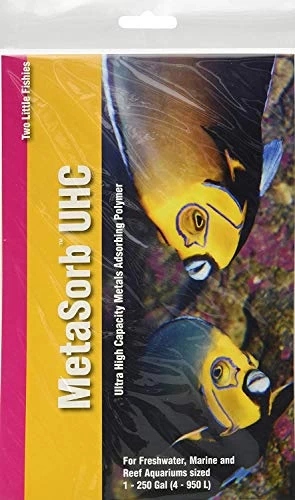 Two Little Fishies MetaSorb UHC helps to restore normal water quality by permanently removing toxic heavy metals from freshwater, marine and reef aquariums. The 1 to 250 gallon bag removes 80 ppm of metals from 250 gallon aquariums. These unwanted metals enter their atmosphere through foods, artificial seawater mixes, therapeutic treatments, corroding metal equipment, magnets, pumps and more. MetaSorb UHC is a polymer powder contained in a small cloth media bag. This cloth media bag should be placed in an area where high water flow volumes will come in direct contact; thus, they should be placed in any canister filter, hang-on-the-back power filter or in flow-through sections of any sump or filter chamber for a few days. This filter media bag can be hang-dried and used several times more when needed. Take the extra step to assure your aqua life is healthy and safe from a toxic environment to assure a successful and long-lasting aquarium. Proudly made in the USA!
